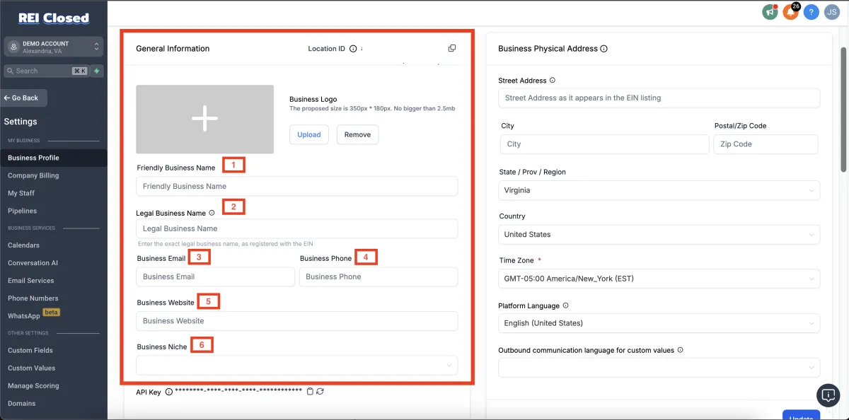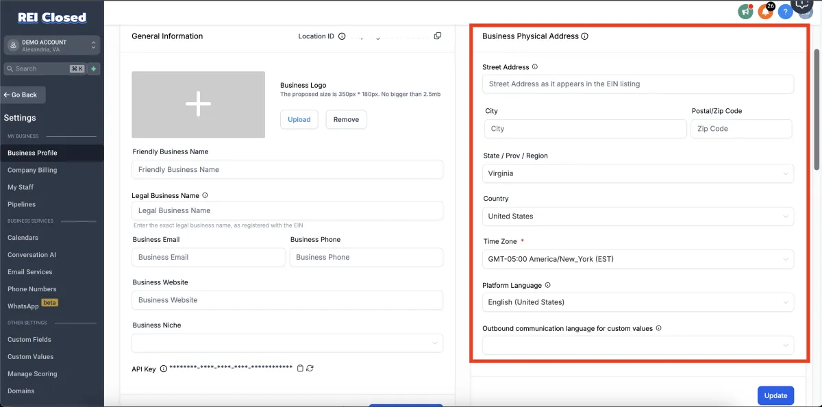 You are also required to include your time zone. Changing the time zone will impact your triggers, appointment booking, and more. Lastly, select your preferred language, the selected language will be used by the system as default.