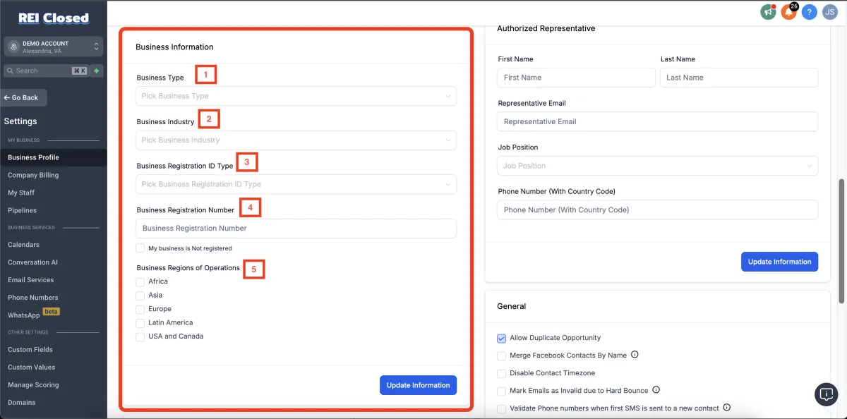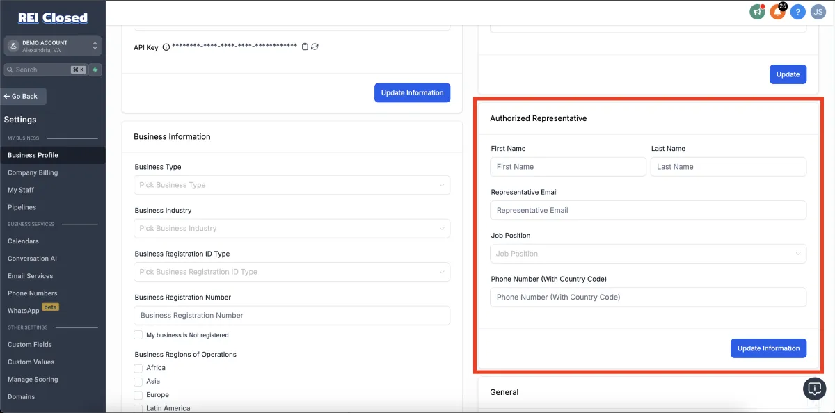The Authorized Representative, or the owner of the account, will go here. Type in the person's First & Last name, Email, Job position in your company, and his/her phone number with the country code.