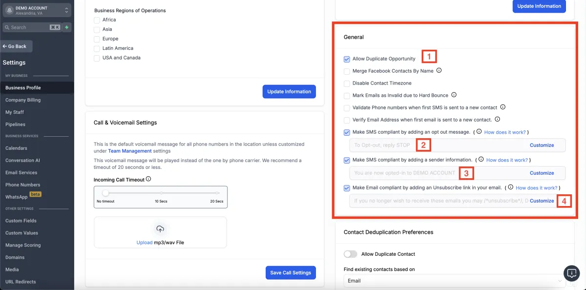 Make SMS compliant by adding sender information - This Messaging Policy applies to SMS and MMS messaging channels through all the flows available in LeadConnector. It allows contacts to receive messages unhindered by filtering or other blockers. If activated, the sender information will be automatically added to the first SMS message of any Bulk Messages to ensure compliance and increase the delivery rate.
